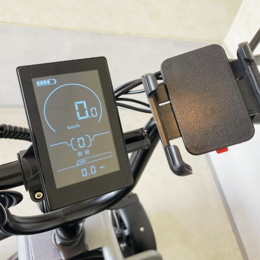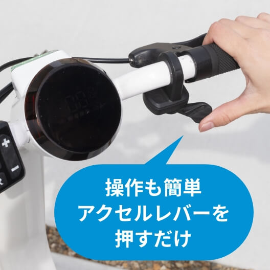10インチの4輪とサスペンションで安定した走行を実現。最高速度は、歩道走行用の6km/hモードと車道走行用の12km/hモードの2種類を切り替えられます。バッテリーは8時間充電で最大30km走行可能です。